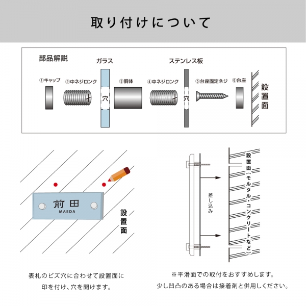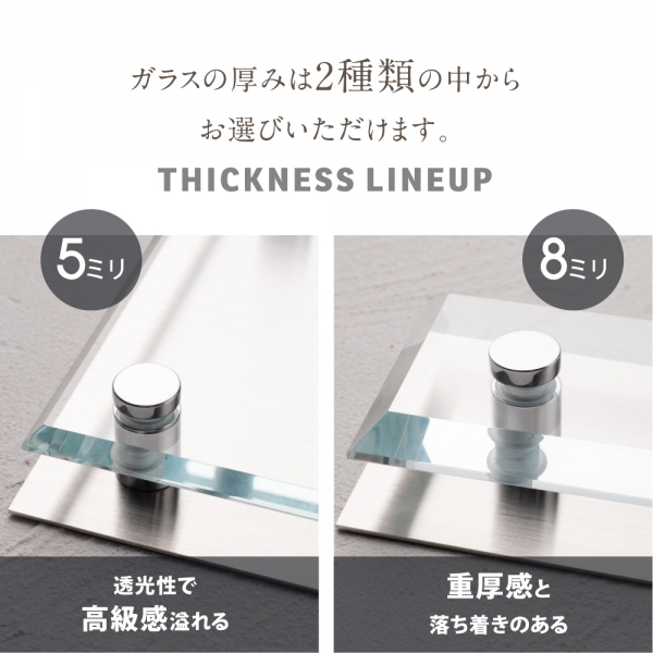 【商品詳細】 【透明ガラスサイズ】 約W190mm×H90mm 厚み:約t5mm/t8mm 【本体】 t5/t8mm透明ガラス×1.5mmステンレス 【部品】 化粧ビス