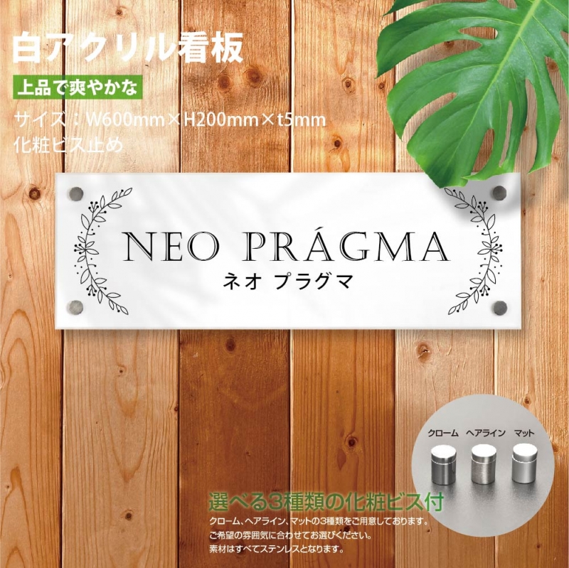 -【商品詳細】- 【サイズ】 H200mm×W600mm×t5mm 【化粧ビス】 ステンレス製(4個付き) 【加工】 UV印刷加工 【取り付け】 化粧ビス止め 【納期】 デザイン確定後、3営業日以内に発送