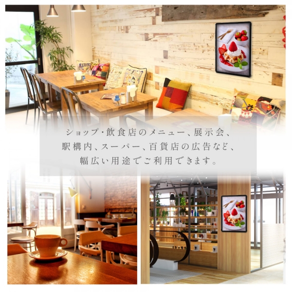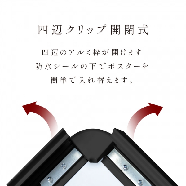 前四辺が開けられるため、壁につけたままでも、掲示物の入れ替えが可能! 掲示物を頻繁に入れ替える必要がある場所でのご利用に最適。 フレームは、安全配慮で四隅を丸くしたスリムタイプです。 駅、ホテル、公共施設、や金融機関、飲食店などの商業施設でご好評をいただいております。