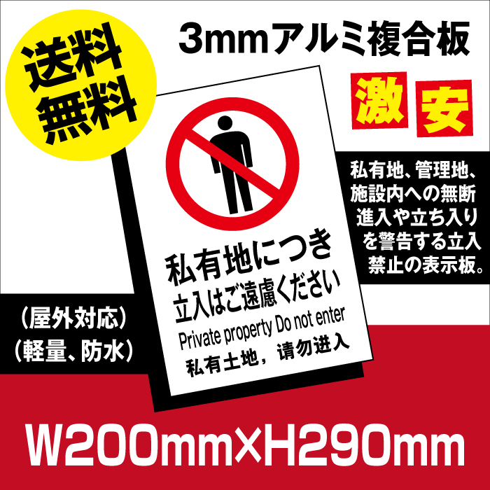 プレート看板 「私有地につき立入禁止」 W200xH290mm warning-102
